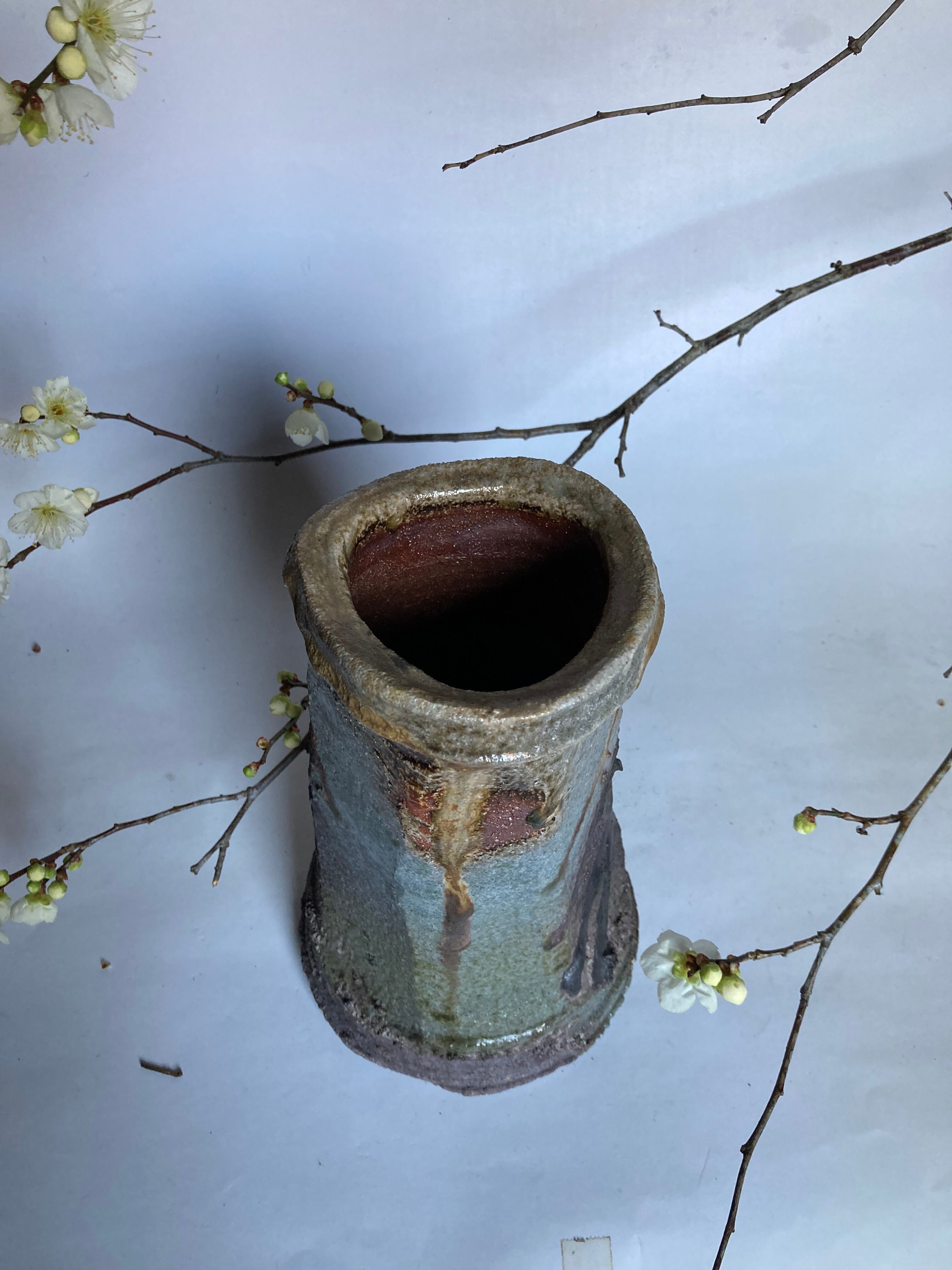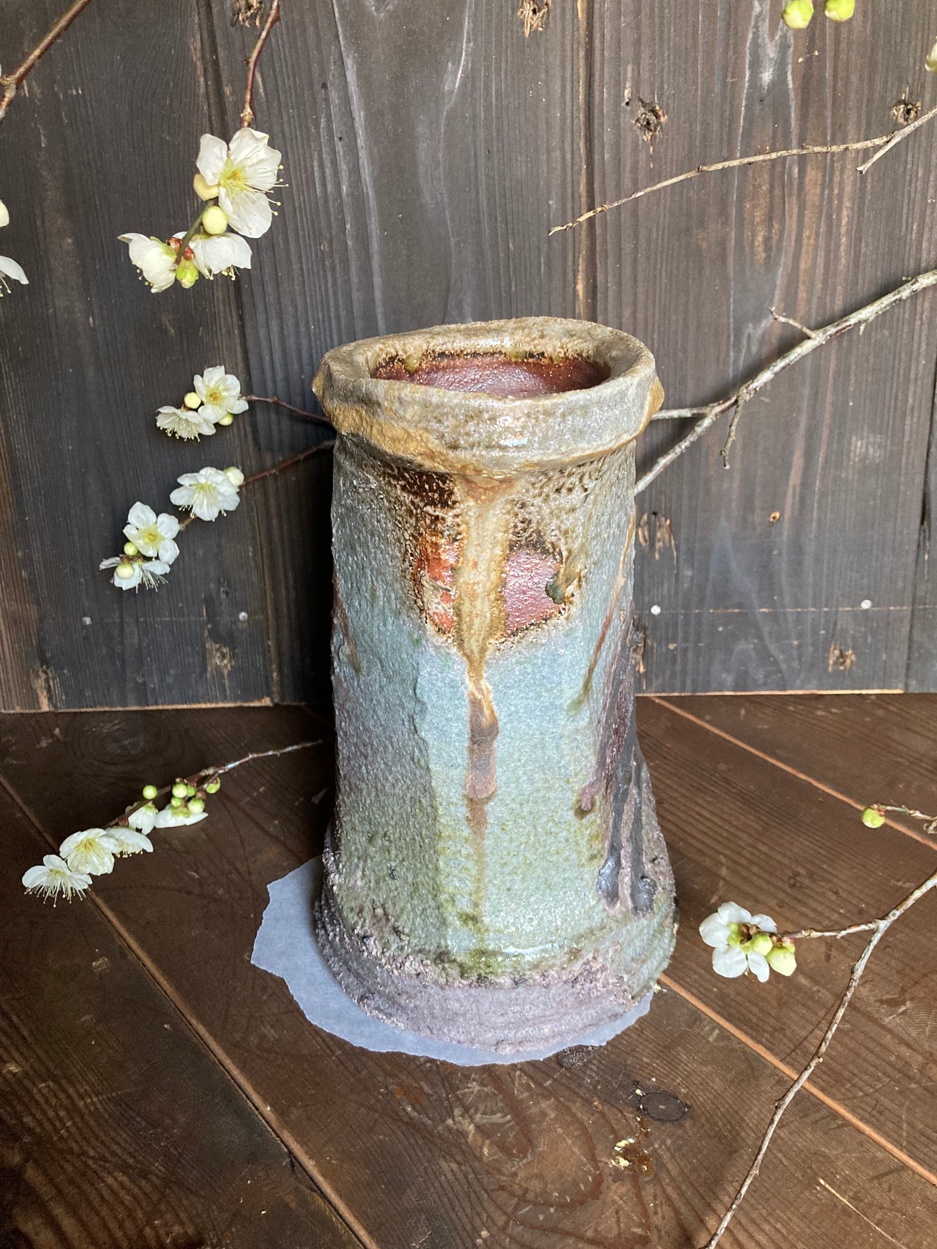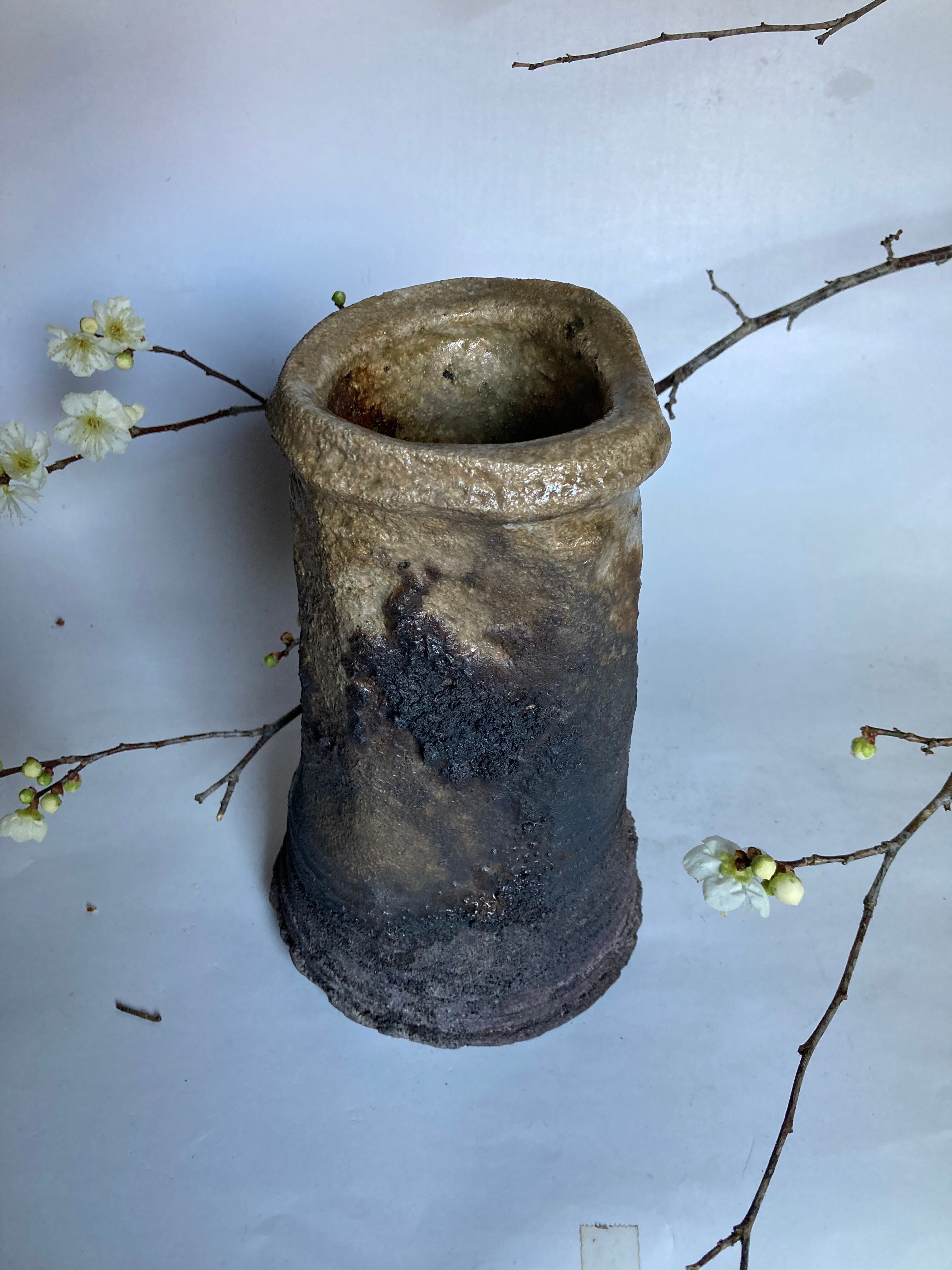 10✕10✕H23 灰被りと還元焼成の作品です 灰が被りすぎて溶け出した跡が、力強さを表しています